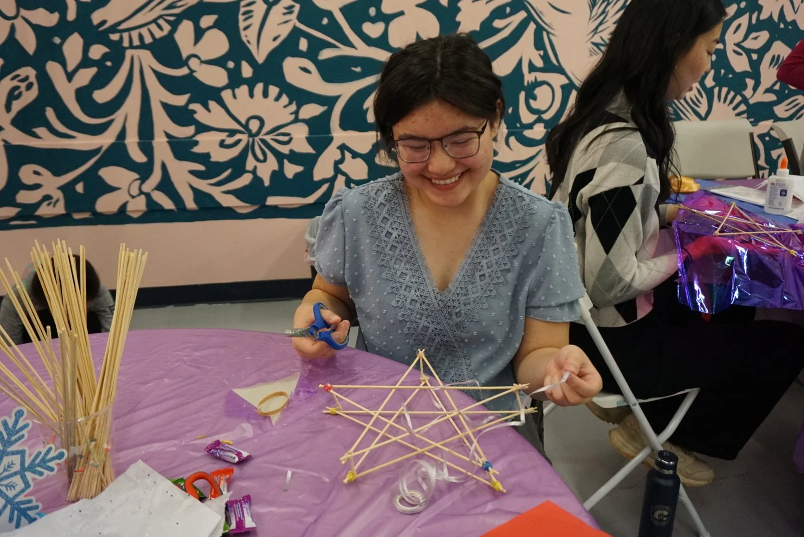 The table was led by AGI’s Marketing Manager Abigail Regucera (she/her), who shared memories of seeing Parols while visiting family in the Philippines in 2019. Youth Leadership Collective members Jessica A.(she/her), Gia P.(she/her), and Emma B.(she/her) supported participants as they cut, folded, and decorated.